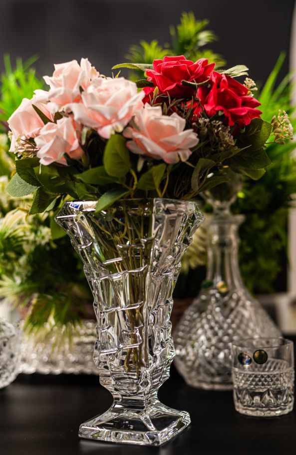 Vaza moderna, cu taieturi chic si picior patrat.