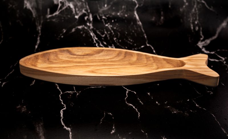 Acest platou din lemn în formă de pește ar fi ideal pentru a servi fructe de mare, sushi sau alte preparate culinare cu tematică marină, sau pur și simplu pentru a fi folosit ca element de decor în bucătăria sau livingul dumneavoastră.